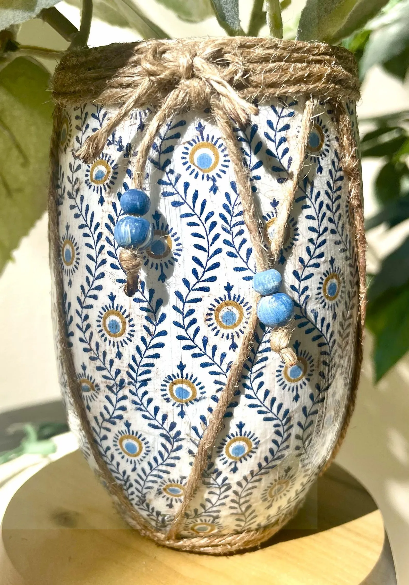 Material: Repurposed glass with decoupage, paint, and sealant. Bumpers or felt are placed underneath to protect furniture. Embellishments pictured are cotton twine and wood beads.