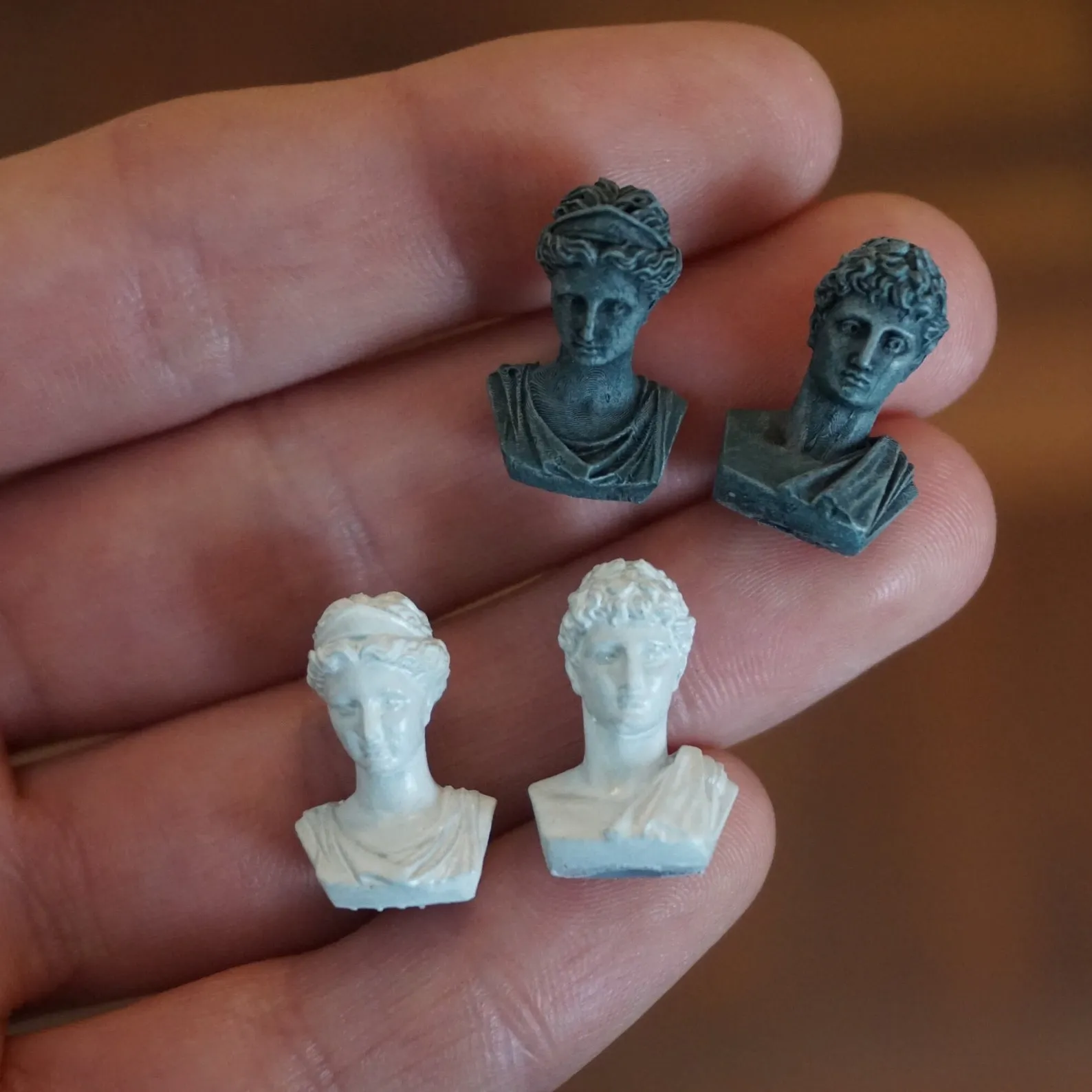 These statues are approximately 2 cm tall, 1.3 cm in width and 0.9 in depth.
