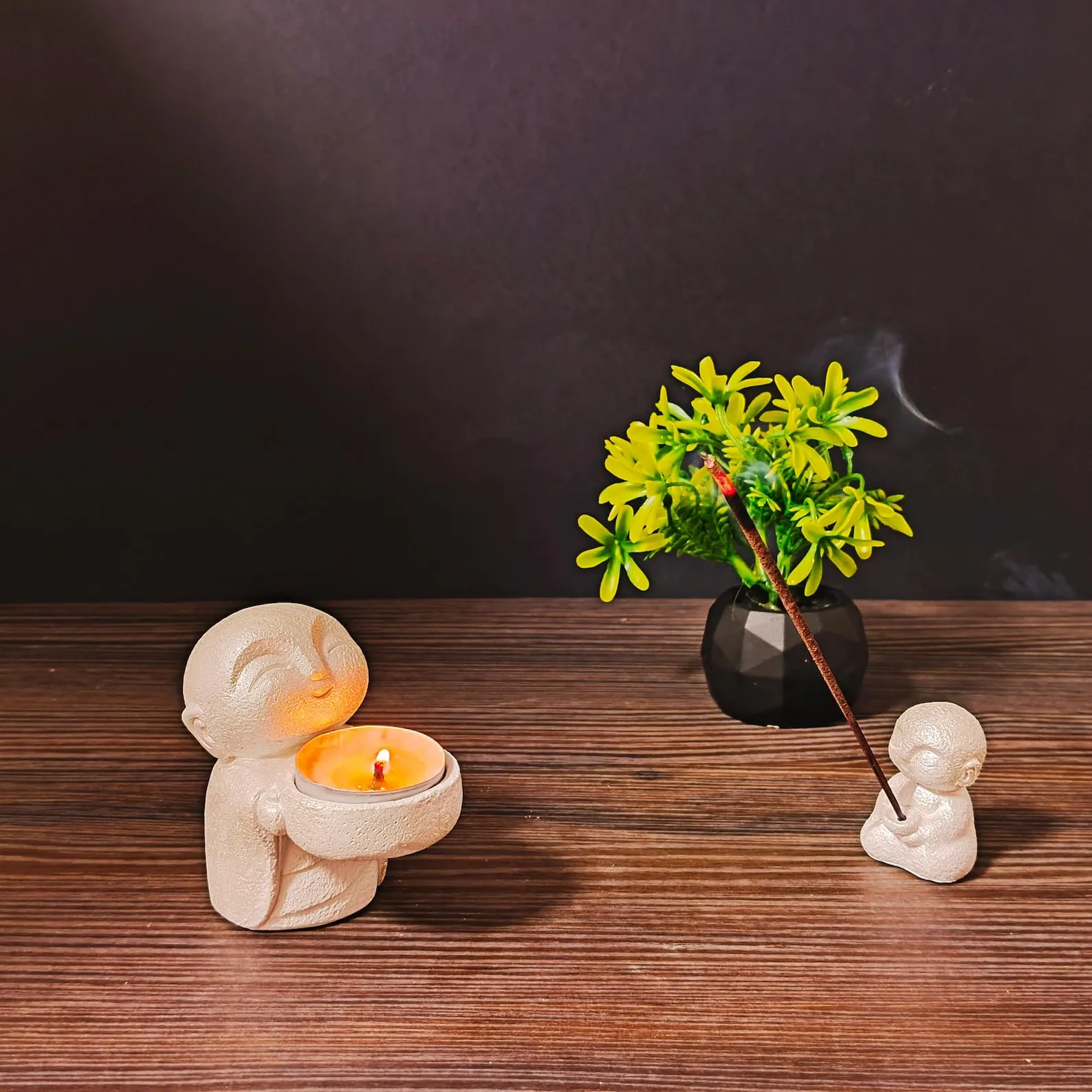 Set of 2 Buddhist Monk Candle Holders & Incense Stand – Zen Spiritual Decor Gift.