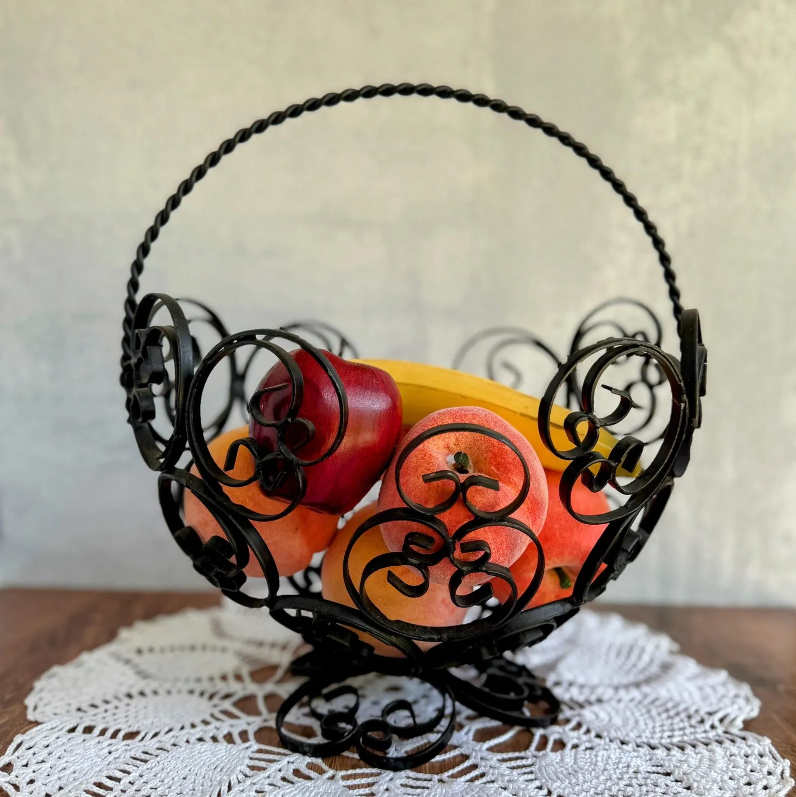 Add timeless charm to your kitchen or tabletop with this vintage wrought iron fruit basket. Featuring intricate scrollwork and a twisted metal handle, this sturdy black metal bowl is both decorative and functional.